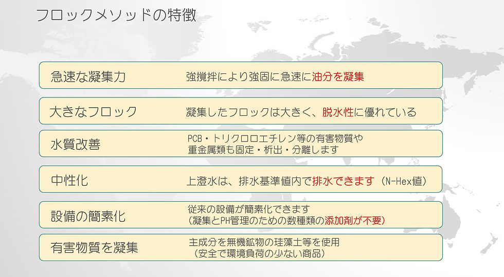 今まで凝集しなかった油混じりの廃水(ノルマルヘキサン)処理が可能。